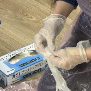- 2.使い捨てエプロンと手袋を装着します。手袋は二重にするとよいでしょう。