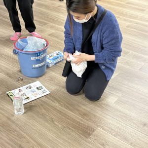 - 4.汚染された床もペーパータオルに消毒液をしみこませ浸すように拭きます。