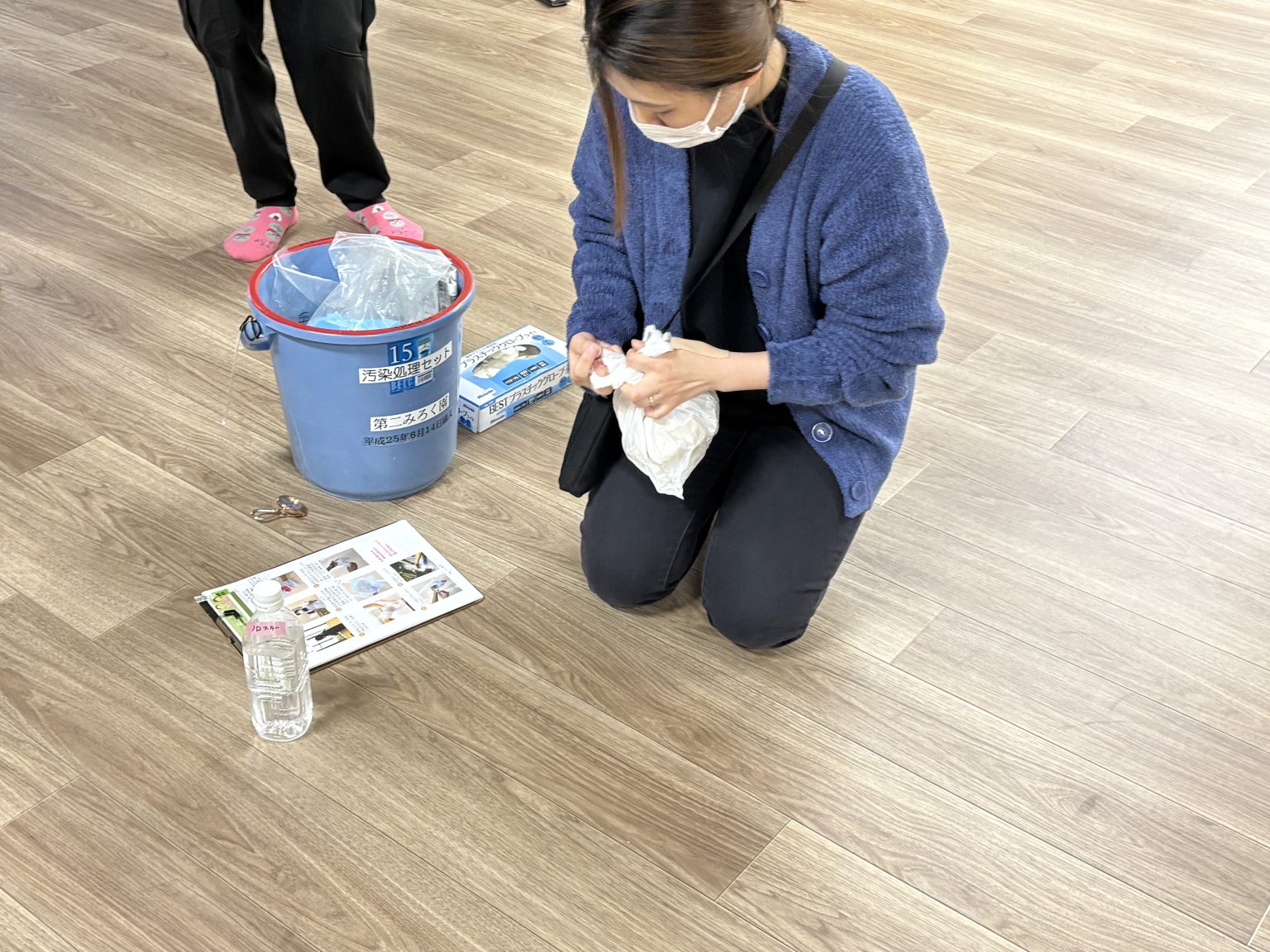 - 4.汚染された床もペーパータオルに消毒液をしみこませ浸すように拭きます。