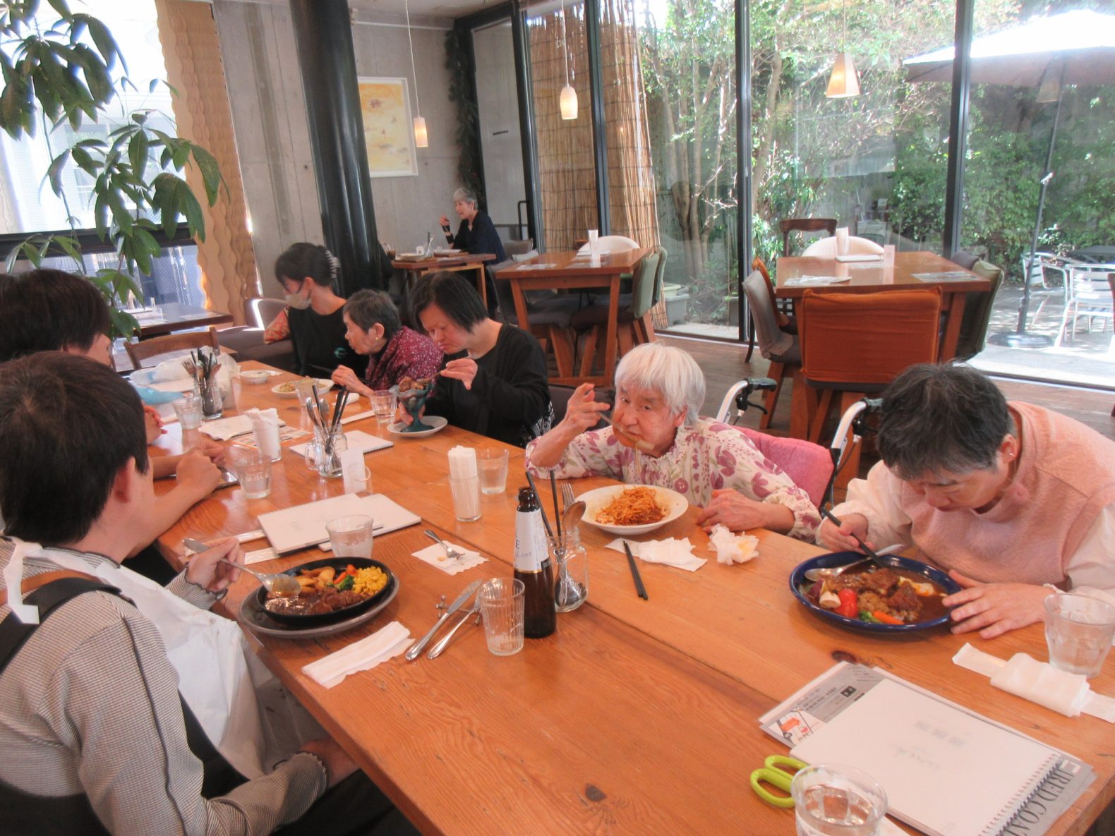 ランチクラブでは男性が10/1(火)びっくりドンキー折尾浅川店、黒崎店へ、女性が10/4(金)直方の農家の食卓、飯塚のアルクカフェへ、それぞれ2班に分かれて行きました。ハンバーク、しょうが焼き、オムライスなど好きな食べ物を選び、食後のデザートや飲み物なども頼まれ、普段とは違った食事ができて、満足されていた様子でした。