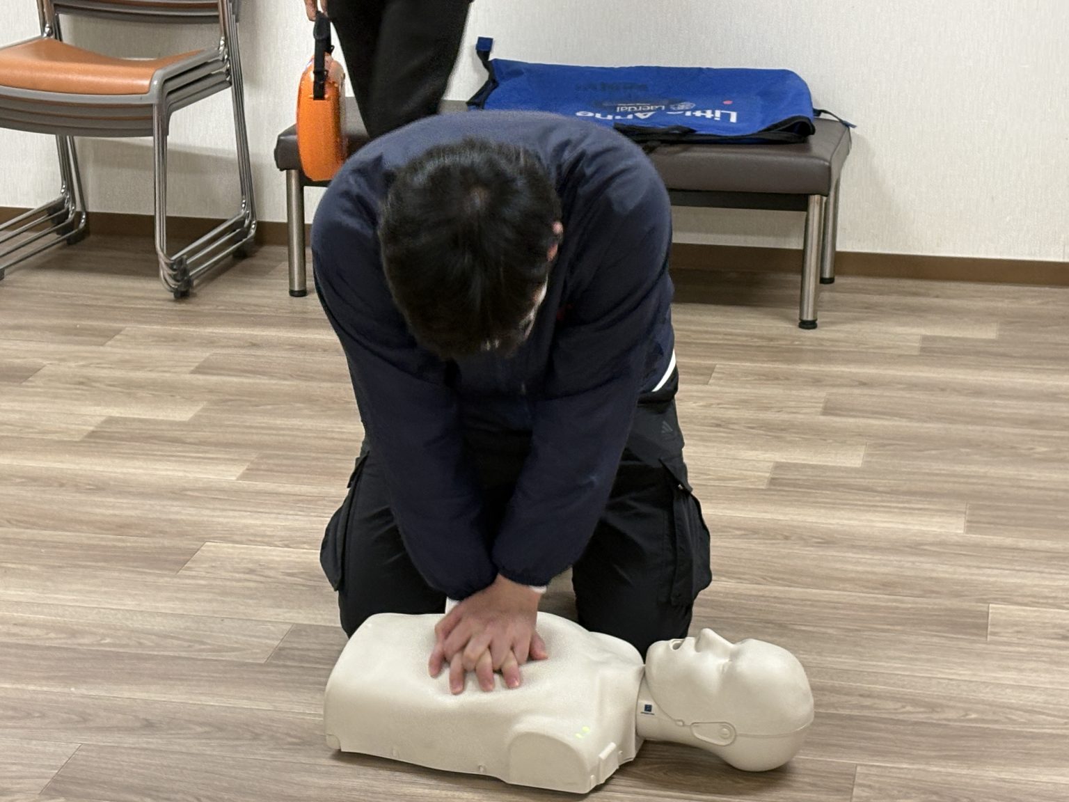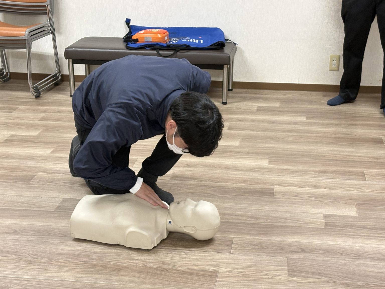 - 7.AED機器がピコピコとリズムをとってくれるのでそれに合わせて胸骨圧迫を続けます。