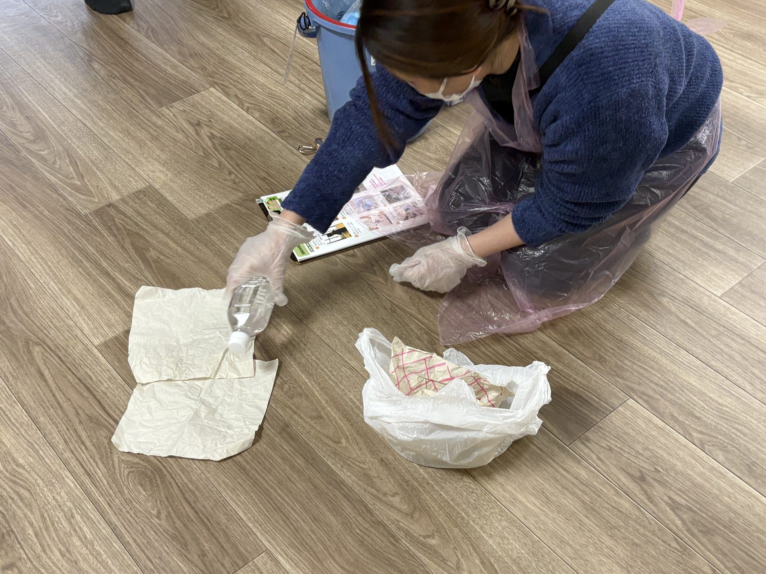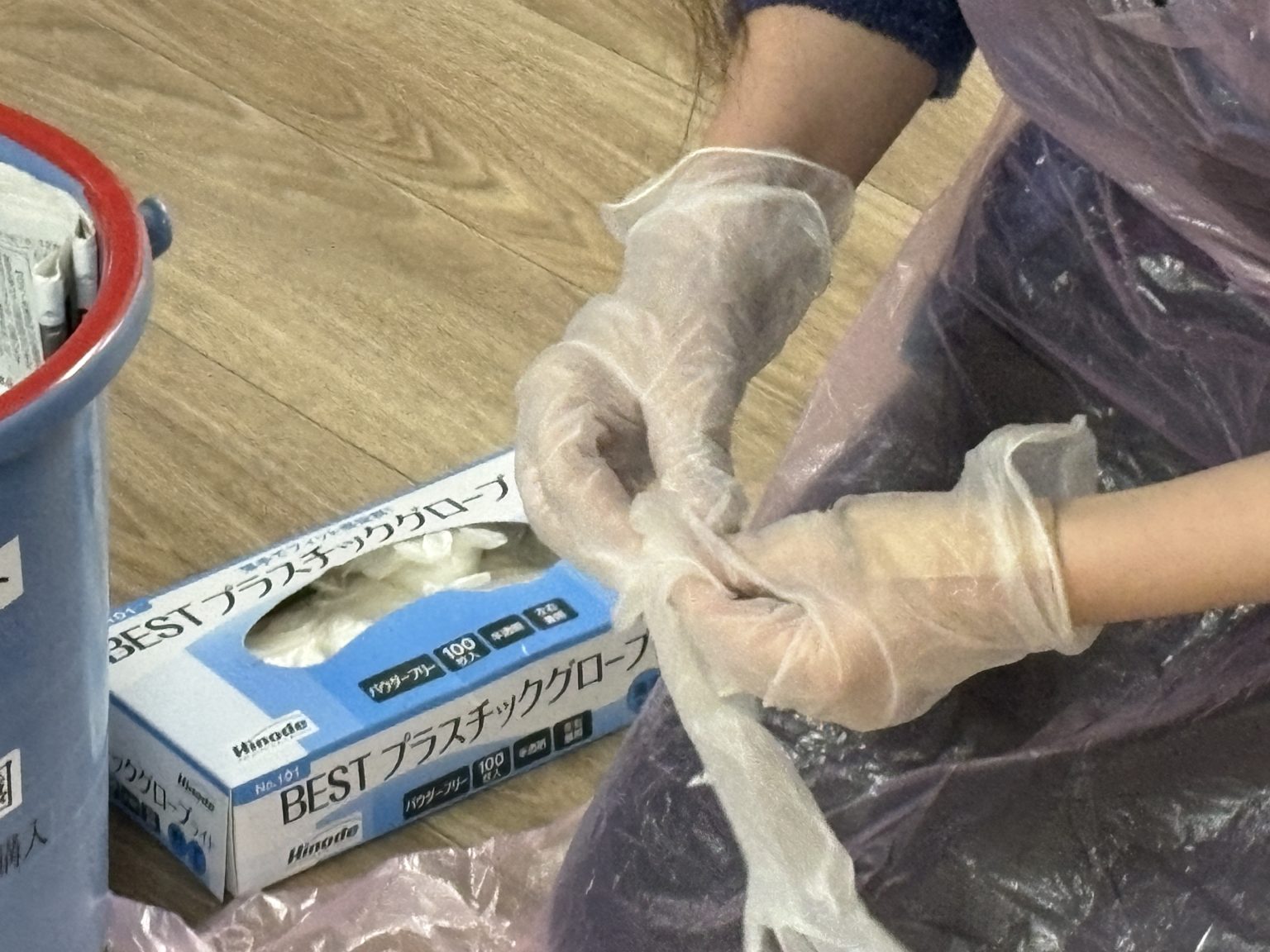 - 2.使い捨てエプロンと手袋を装着します。手袋は二重にするとよいでしょう。
