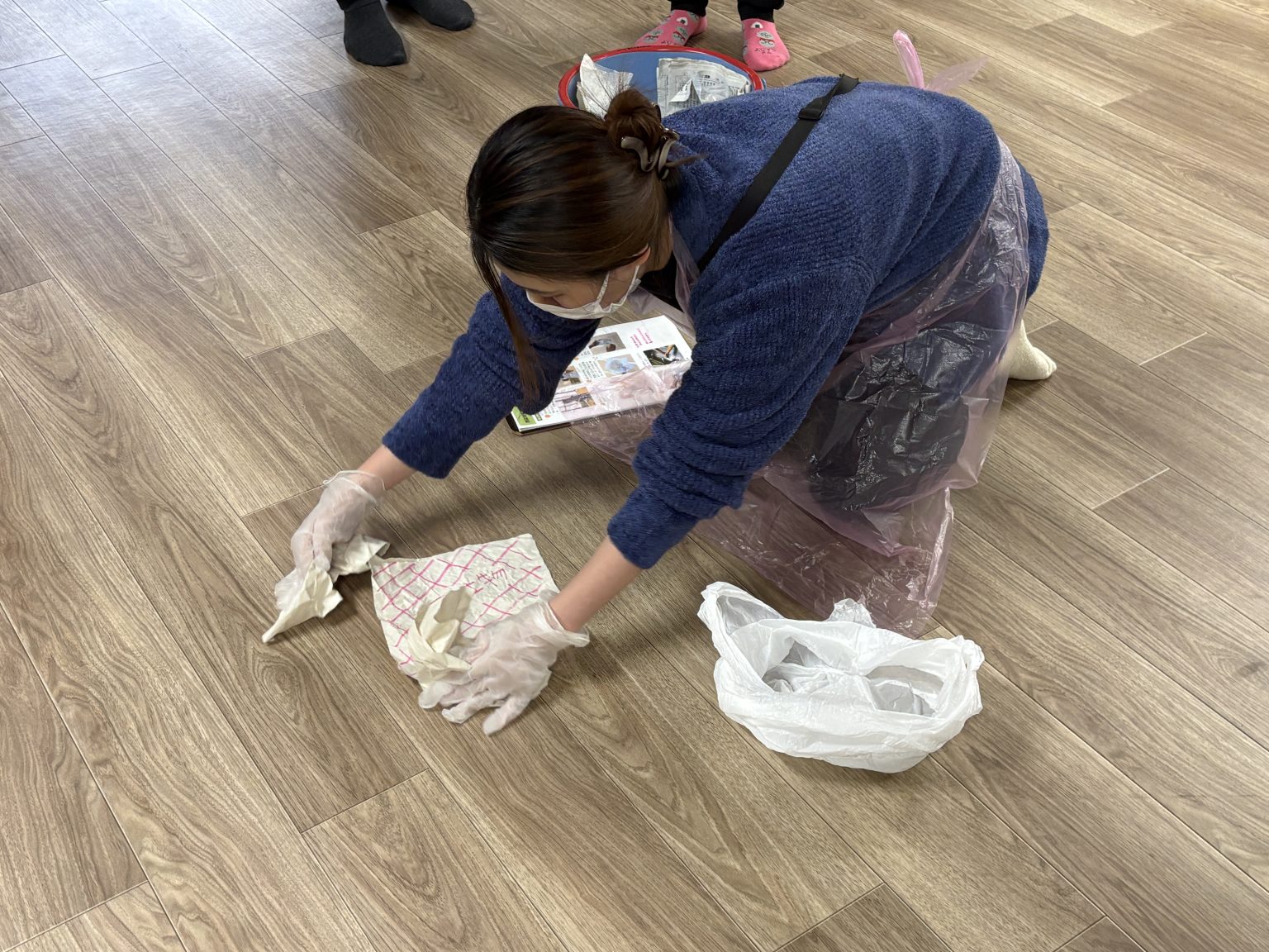 - 4.汚染された床もペーパータオルに消毒液をしみこませ浸すように拭きます。