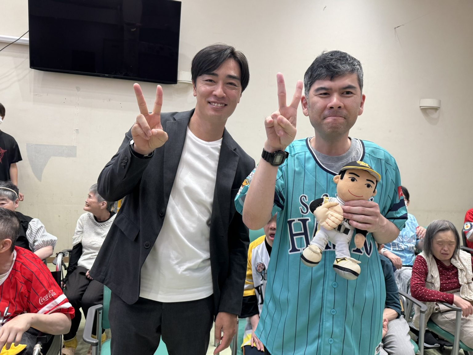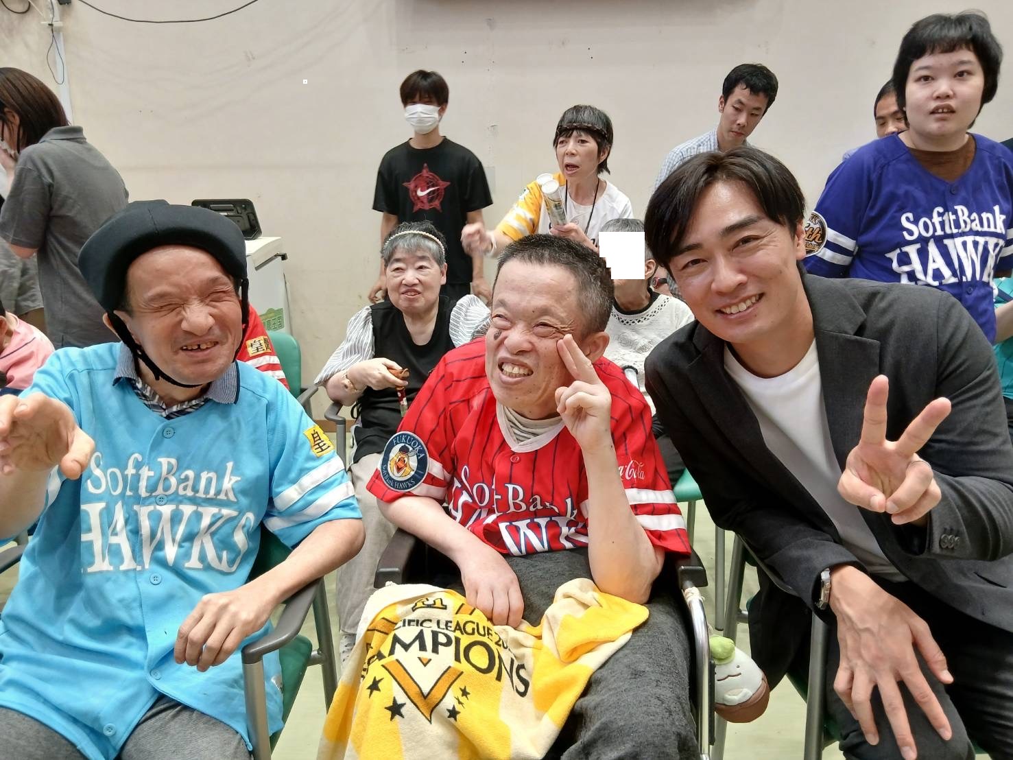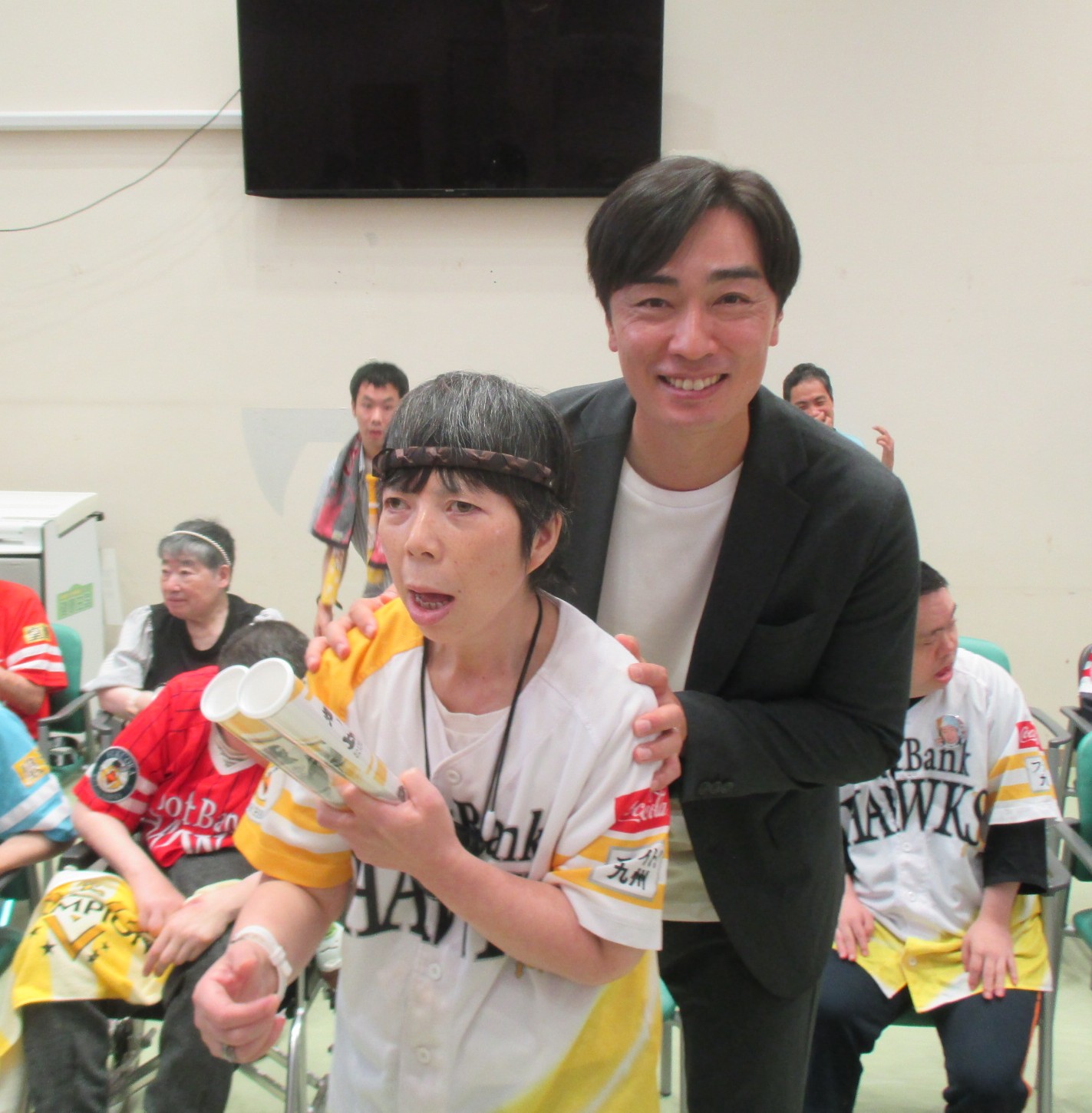 令和7年10月18日(土)福智町地域交流センターにて福岡ソフトバンクホークス・球団統括本部付アドバイザー和田毅氏による講演・トークショーと、映画「ケアニン~こころに咲く花~」の上映会を行いました。講演後に和田氏が第二みろく園へ来園して頂き、記念撮影を行いました。利用者様も職員も大熱狂され思い出深い日となりました!
